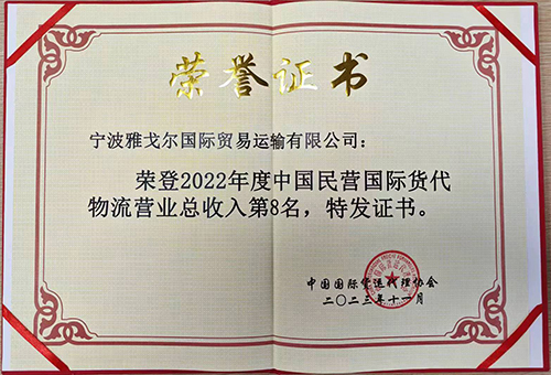 榮登2022年度中國民營(yíng)國際貨代物流營(yíng)業(yè)總收入第8名 |